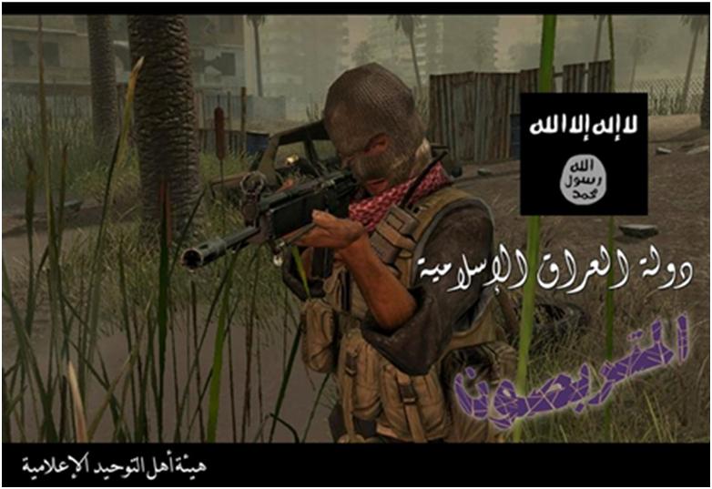 In support of the “Islamic State of Iraq”, with the logo and a religious slogan embedded, this picture was addressed by the “Media Council of the People of Tawhed” in a jihadist forum. Particularly appealing may be the detail, besides combating US troops in a Middle Eastern environment, the Mujahid is also wearing the shmakh, the classical Arabic (Bedouin) headdress, as a scarf.