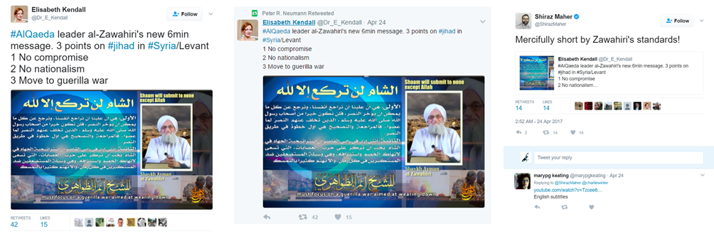 In April 2017, al-Qaeda leader al-Zawahiri released a new speech. After an initial tweet by Elizabeth Kendall, covering the key points from the speech @marypgkeating responded posting a link to the speech on YouTube with ‘English subtitles’, while others join in retweeting.