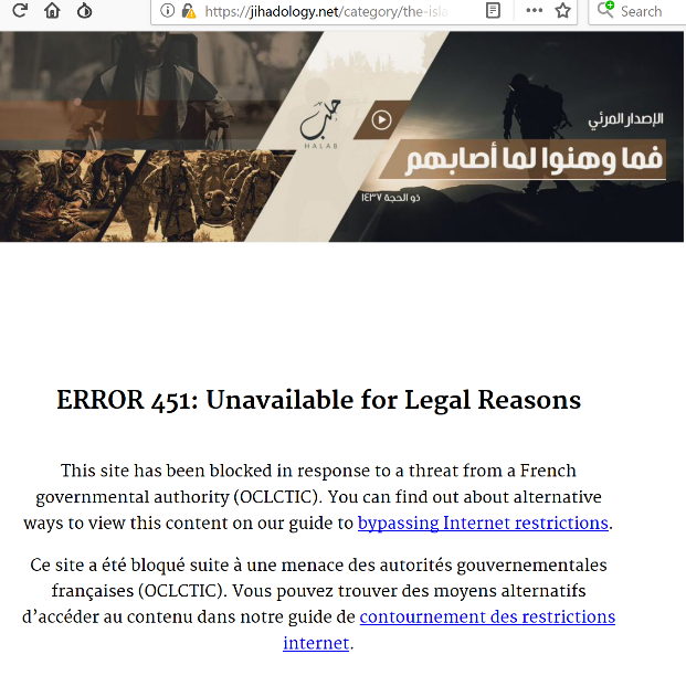 However, various European countries take different views on what to do about sharing content from groups they deem illegal or extreme. At the time of writing, in France Jihadology is unavailable.