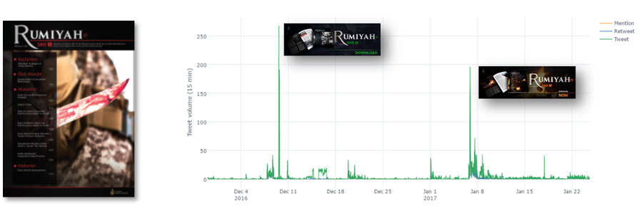 To test whether there is evidence that Jihadology is an isolated case, we turn to the releases of the multilingual magazine Rumiyah using the #Rumiyah hashtag. If Jihadology is an isolated case, we would expect the initial release of each edition of the magazine, to be met with a surge of tweets about it on Twitter from ISIS accounts and supporters. The example below shows that the surge of tweets occurred.