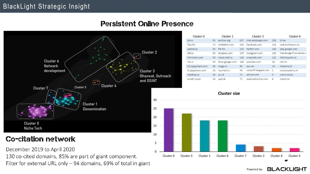 The session built on 2019 the publication by Emily Winterbotham, Dr Ali Fisher and Dr Nico Prucha. This is the largest ever study of traffic between the online platforms that comprise the Jihadi information ecosystem. This study included 24 months of data from the core of the Salafi-Jihadi Telegram network and revealed the inner workings of their multiplatform communication paradigm. The paper demonstrated the different roles that platforms play within the multiplatform information ecosystem, including Telegram, Tamtam, and Matrix.